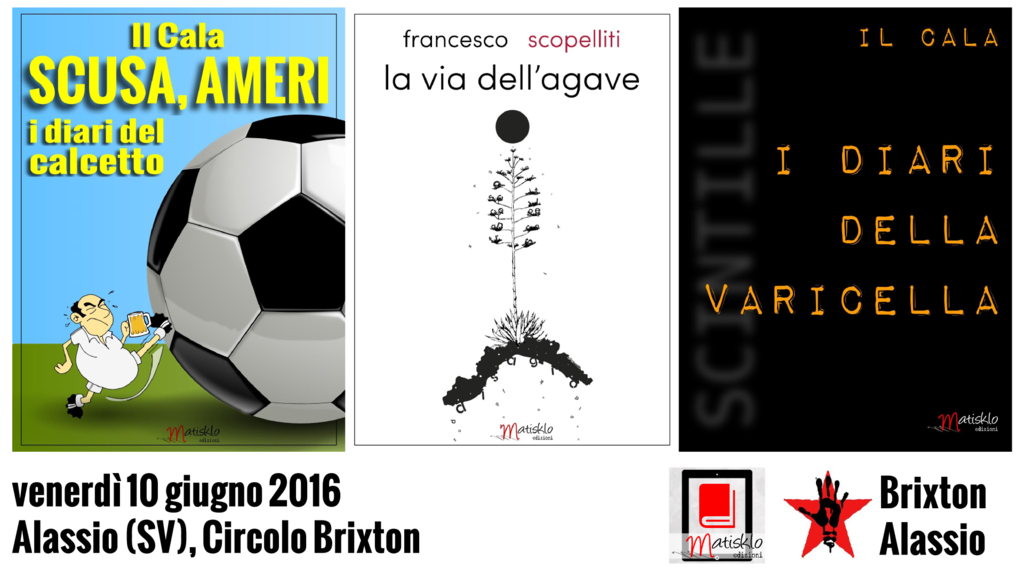 In occasione dell'uscita della seconda edizione delle raccolte di racconti "La via dell'Agave" dell'imperiese Francesco Scopelliti e "Scusa, Ameri - i diari del calcetto" del finalese Alberto "Il Cala" Calandriello, l'Associazione Culturale Matisklo - Matisklo Edizioni organizza, presso il Circolo Brixton di Alassio, una lettura-presentazione dei libri da parte dei due autori venerdì 10 giugno, a partire dalle 21:30.