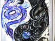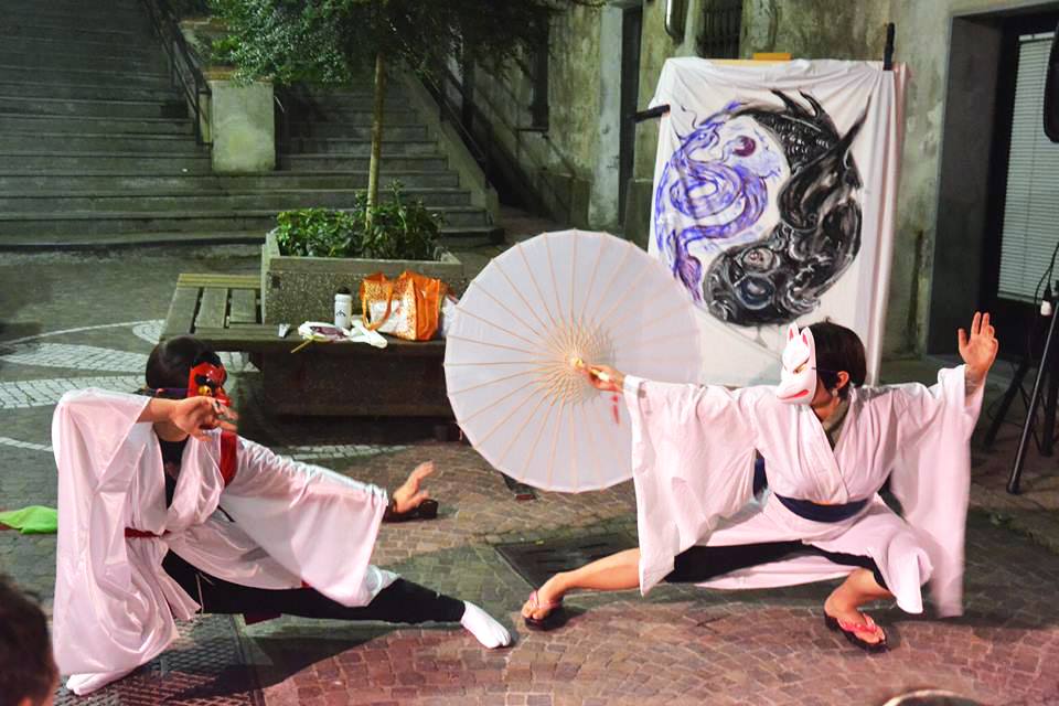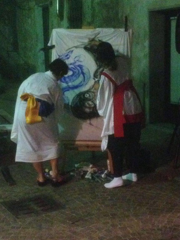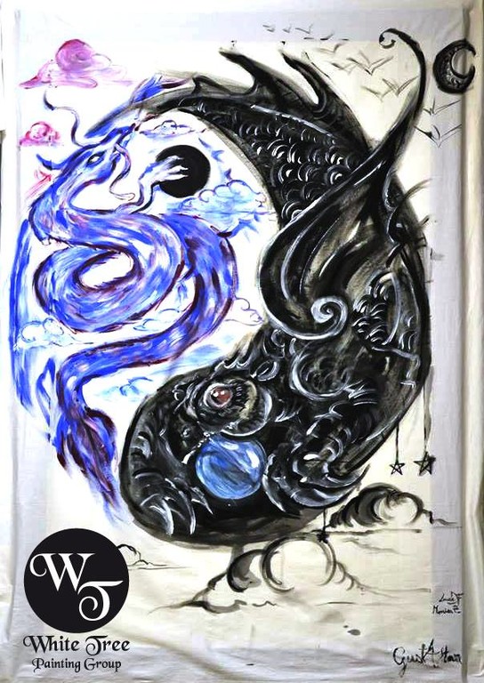 "L'affresco è stato realizzato su un pezzo di stoffa bianca che abbiamo usato come parte della scena, stendendolo su un apposito telaio prima di dipingere il loco e come oggetto - spiegano - abbiamo optato per il tao, come unione degli opposti (in questo caso due draghi), rappresentati anche da noi durante la serata (una donna gatto e un demone)".