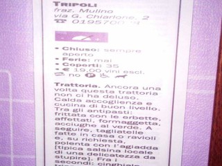 "Da anni la trattoria Tripoli e una meta obbligata per chi ama veramente la buona cucina, la cucina di un tempo. Infatti la signora Dogliotti Alessandra titolare della trattoria e alla 4 generazione di donne della stessa famiglia che si sono alternate ai fornelli nel corso degli ultimi 115 anni.