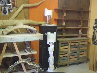 Un luogo dove ogni pezzo di legno di scarto sembra avere un’altra anima, che aspettava semplicemente un paio di mani per venire allo scoperto. Dei vecchi bancali vengono così riconvertiti in comodino e cassettiera. Dei legnetti recuperati sulla spiaggia d’inverno diventano soprammobili, così come i protagonisti di una lampada. Lo scaffale viene assemblato con legni di scarto, così come il mobile contenitore.