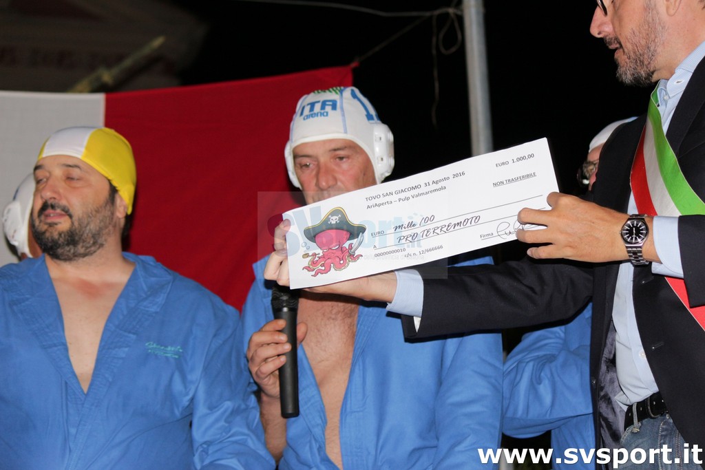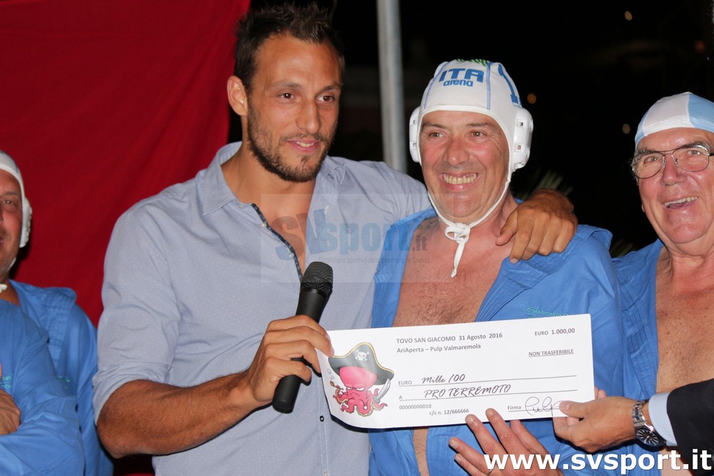 Nel corso della serata non sono mancati momenti esilaranti: travolgente la presenza del gruppo "Pulp in Val Maremola" che assieme ad Aicardi ha improvvisato un improbabile squadra di Nuoto Sincronizzato maschile allenata proprio dal centroboa. Per l'occasione, il gruppo goliardico ha deciso di destinare in beneficenza verso i paesi terremotati un assegno di 1000 € a cui si aggiungono i proventi della vendita di alcune magliette autografate proprio dalla stella del Settebello.