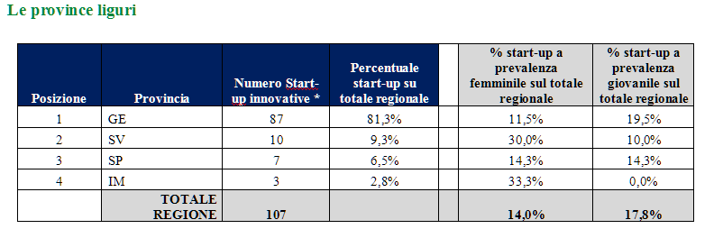 Per quanto riguarda le province è Genova a registrare in assoluto il valore più alto a livello regionale, con 87 start-up innovative (pari all’81,3% del totale regionale). Seguono, con valori nettamente più bassi, Savona con 10 (9,3%), La Spezia con 7 (6,5%) e, fanalino di coda, Imperia con 3 (2,8%).