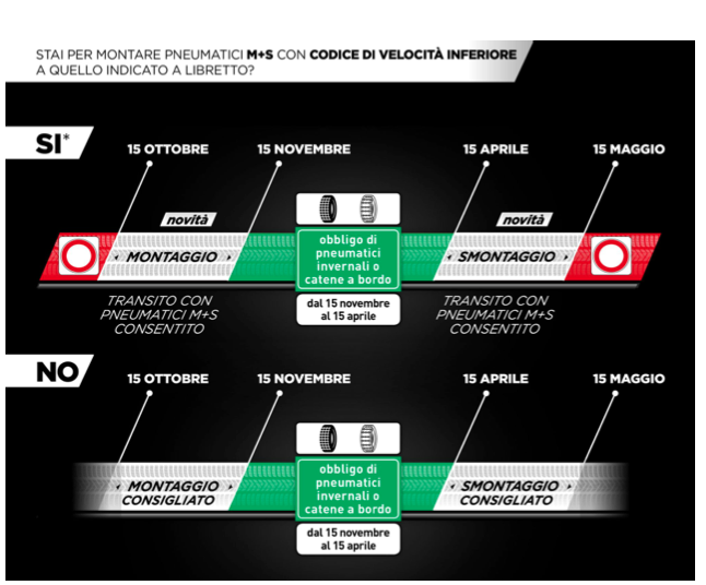 “La legge prevede l’obbligo dell’uso dei pneumatici invernali dal 15 novembre al 15 di aprile – afferma - Ed esattamente un mese prima e un mese dopo è previsto che si possano montare i pneumatici invernali. Se sono omologati con un codice di velocità uguale o superiore a quello che è previsto sul libretto della vettura, il periodo di tempo previsto per il montaggio un mese prima può anche non essere rispettato”.