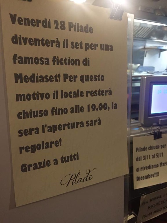 Il cartello esposto all’ingresso del locale parla chiaro: “Venerdì 28 Pilade diventerà il set per una famosa fiction di Mediaset! Per questo motivo resteremo chiusi fino alle 19, ma la sera l’apertura sarà regolare. Grazie a tutti”.