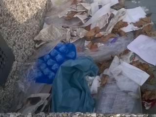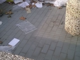 Infatti, come testimoniano le foto, una massa di rifiuti e di fogliame si accumula nelle scale che portano al palazzo di giustizia e nel piazzale di fronte.