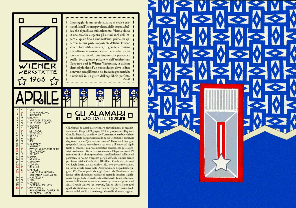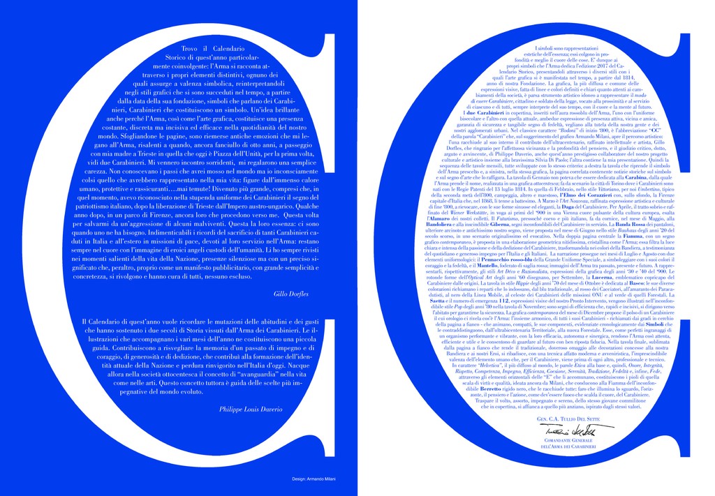 Il tema del Calendario 2017 è incentrato sui "Simboli dell'Arma", che sono la rappresentazione visiva dell'essenza dell'Istituzione. Si susseguono nelle tavole i diversi stili con cui l'arte grafica si è evoluta nel tempo, a partire dall'anno di fondazione dei Carabinieri, il 1814. L'Agenda 2017, in un formato moderno e funzionale e con l'inserto dedicato alla "Musica nell'Arma", presenta un dettagliato excursus storico sui complessi musicali dell'Arma, dalla mitica Banda alle varie Fanfare.