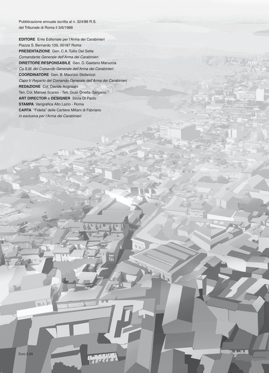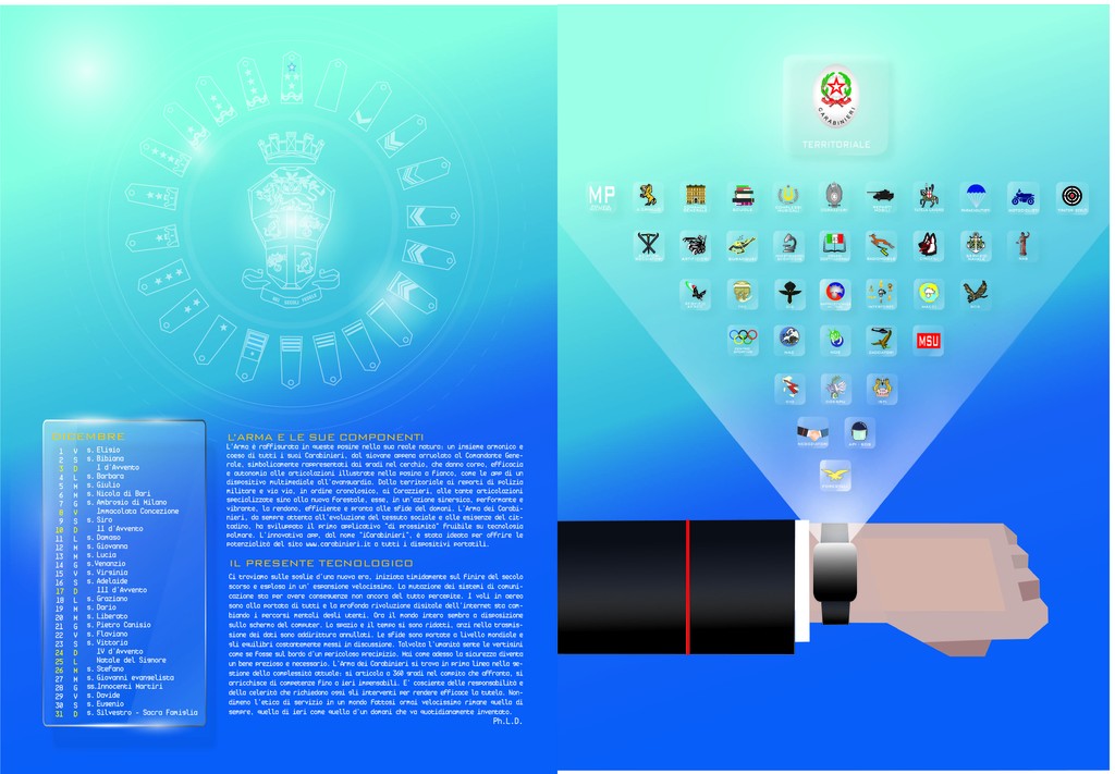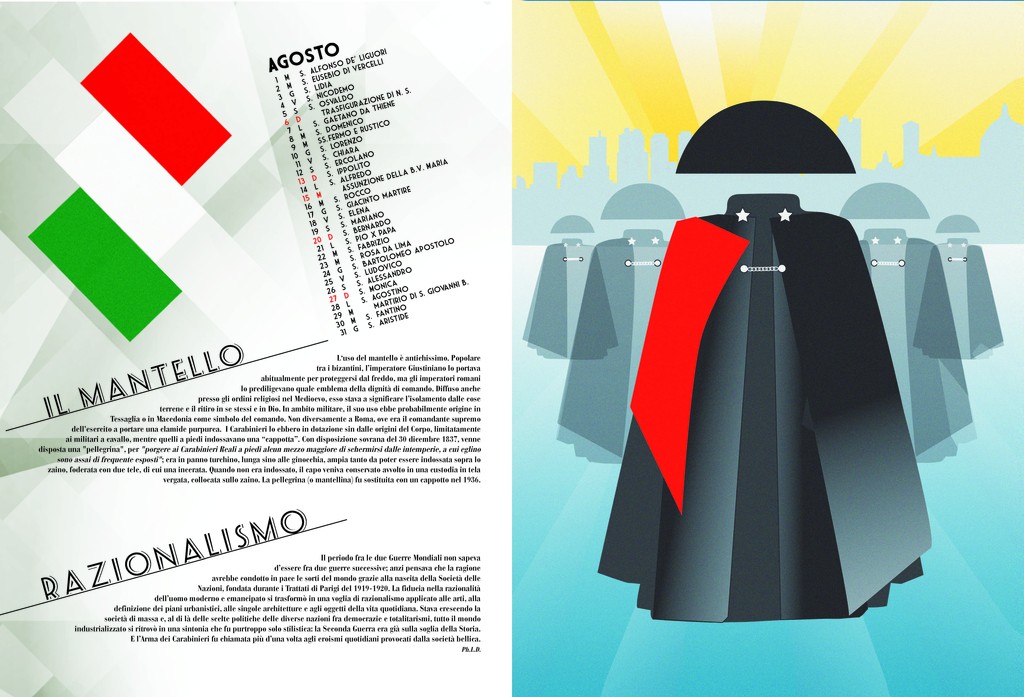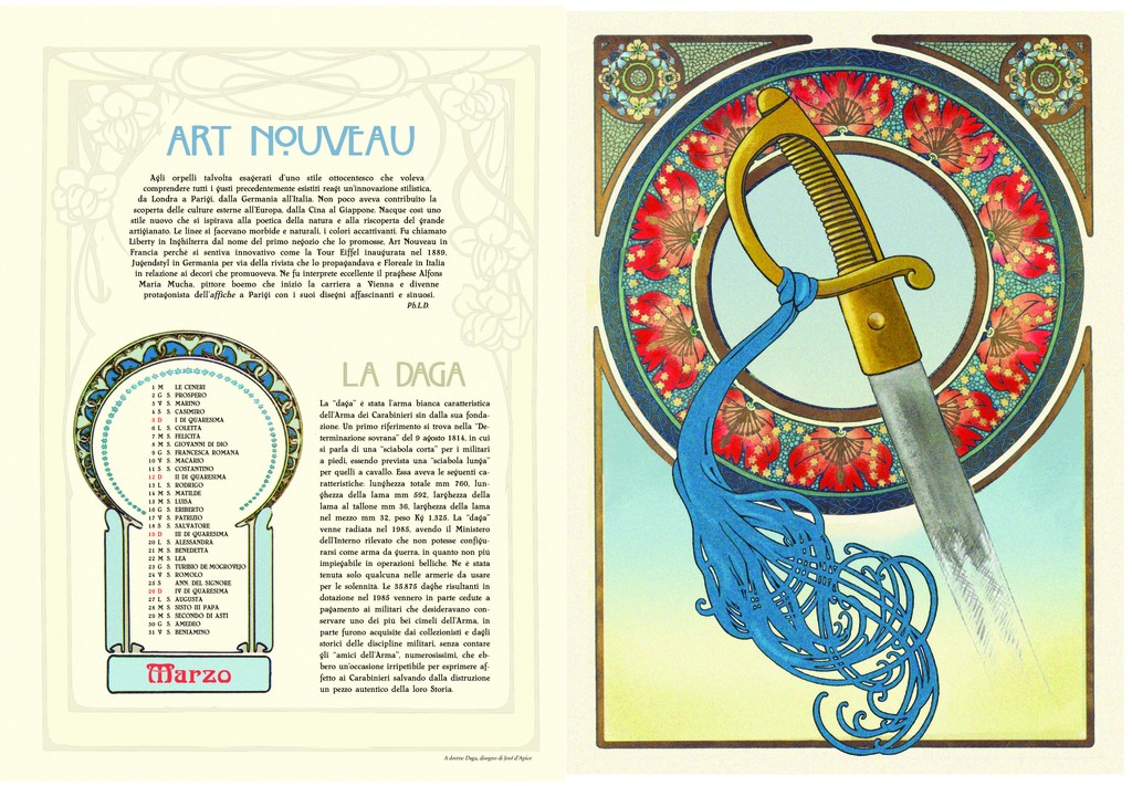 Il generale Del Sette ha descritto il calendario come "frutto di una accurata e innovativa ricerca estetica su aspetti culturali che uniscono l'attenzione alla Storia dell'Arte ai segni distintivi e alla storia dell'Arma", e sottolineato il richiamo "ai valori morali che da sempre sostengono e contraddistinguono la sua opera al servizio delle nostre comunita', di ogni cittadino e di chi ha più bisogno. Valori che devono essere perpetuati e riaffermati nel tempo perché costituiscono la base morale di un modo di sentire fondante e insopprimibile, che fa dell'Arma una forza coesa, affidabile ed efficiente, una istituzione moderna e dinamica, protesa al futuro che guarda con giustificato ottimismo e rinnovato vigore”.