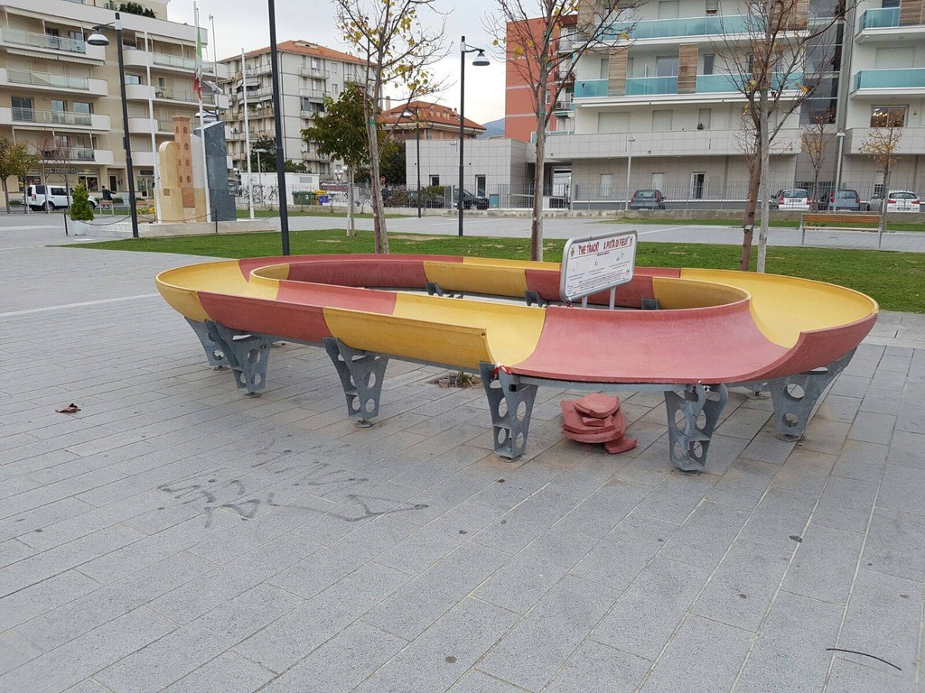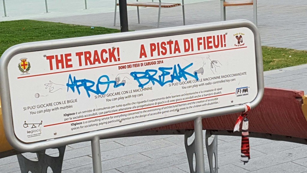 Vandali in azione in Piazza Enzo Tortora ad Albenga, danneggiata la pista delle biglie accessibile a bambini con disabilità donata dai Fieui di Caruggi.
