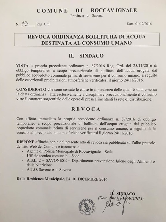 Stesso discorso anche per il Comune di Roccavignale. Commenta il sindaco Amedeo Fracchia: "A seguito delle analisi che abbiamo commissionato possiamo dire che l'acqua è priva di batteri e quindi ora è potabile".