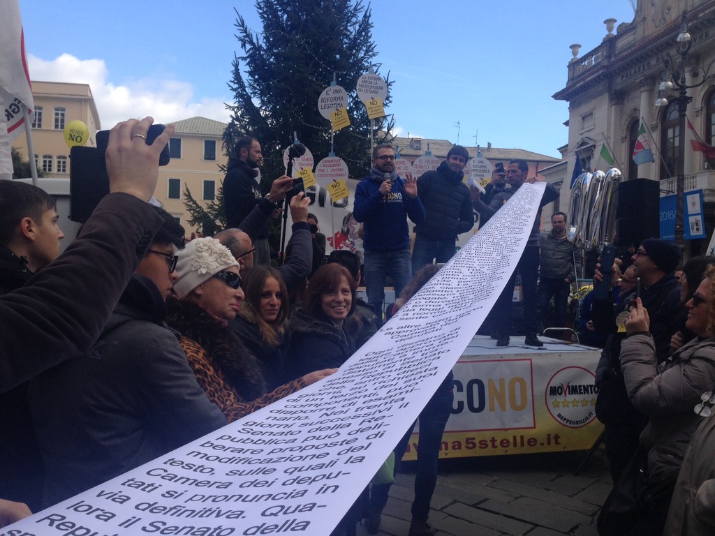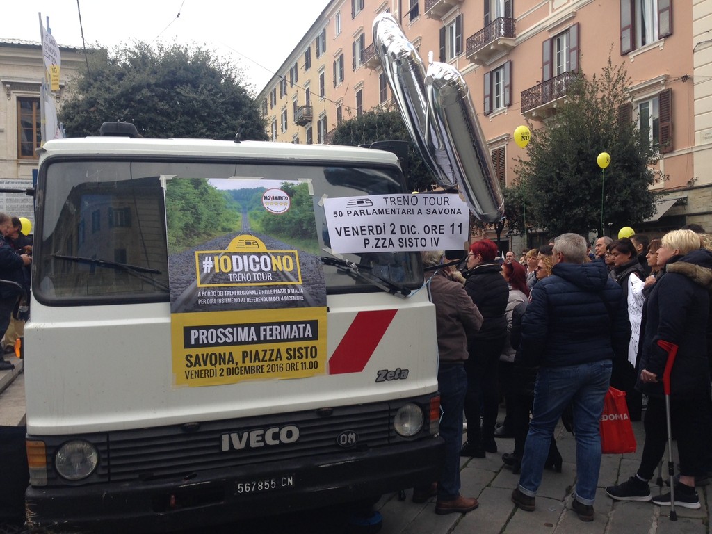 I parlamentari del MoVimento 5 Stelle sono arrivati in stazione e hanno raggiunto a piedi vie e piazze di Savona. I portavoce nazionali, europei, regionali e comunali del MoVimento 5 Stelle hanno percorso più di 6.000 km attraversando tutta Italia a bordo dei treni regionali per raccontare ai cittadini - spiegano - "l'inganno del quesito truffa che troveranno scritto domenica sulla scheda elettorale e per spiegare la riforma costituzionale voluta dalle grandi banche d’affari e dal trio Renzi-Verdini-Boschi".