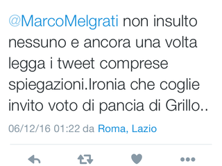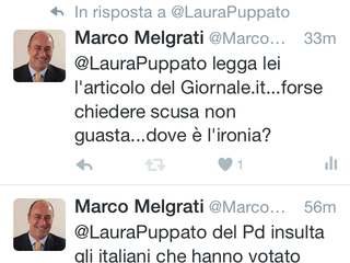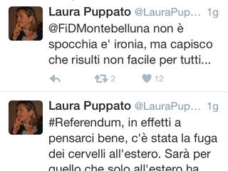E ancora il Melgrati, che nel frattempo aveva letto sull’argomento un articolo de “ilGiornale.it” dal titolo “PD, l’insulto choc agli elettori: “I cervelli hanno votato SI”, del giornalista Claudio Cartaldo: @LauraPuppatolegga l’articolo del Giornale.it…forse chiedere scusa non guasta…dove è l’ironia?