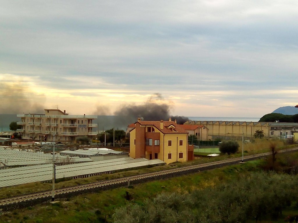 Cassonetto a fuoco poco dopo le 15,00 ad Albenga in zona Vadino nei pressi dell'ex cantiere navale.