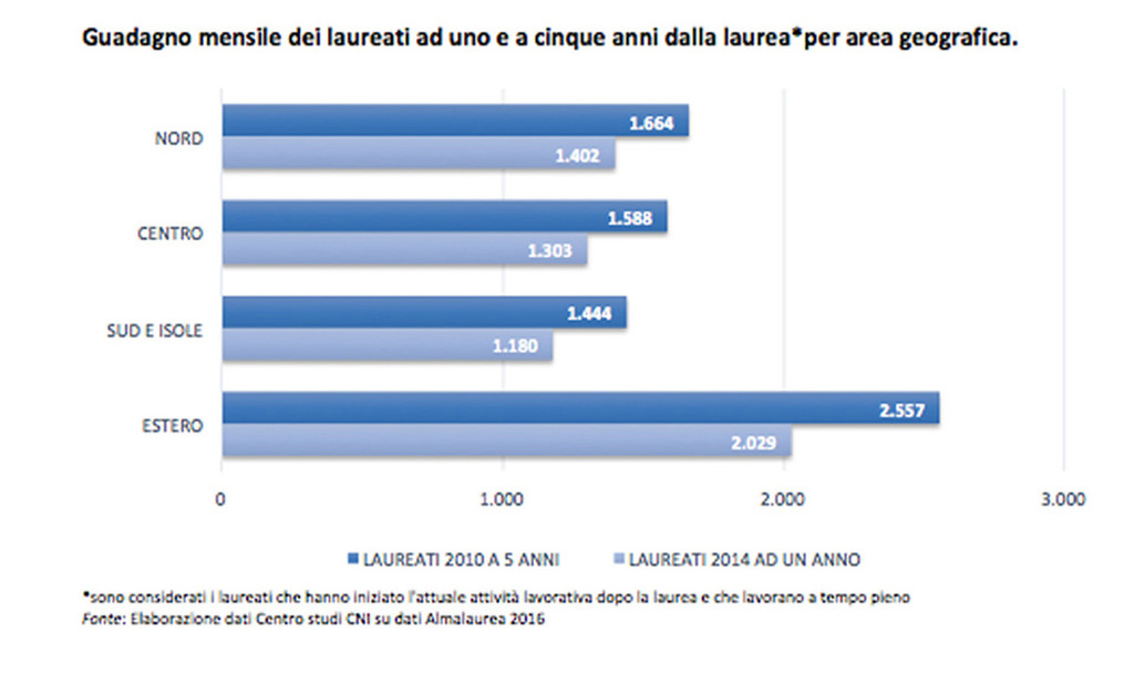 Un ingegnere che a un anno dalla laurea trova lavoro nel Nord Italia guadagna 1.400 euro al mese; nel Centro 1.300, nel Sud 1.180. Se va all’estero, in media 2 mila euro. Secondo i dati del Centro Studi CNI, chi studia materie ingegneristiche ha più chances di altri nella ricerca dell’occupazione, ma anche questo settore conosce il morso della crisi. Secondo quanto denunciato dai giovani ingegneri alla trasmissione “Presa Diretta” di Rai3 il 30 gennaio scorso, il reddito medio della categoria è passato dai 43 mila euro del 2008 ai 31 mila del 2016.
