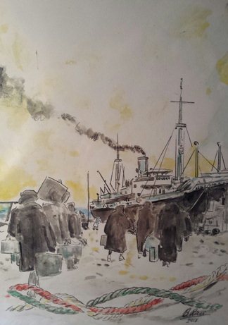 Uno scorcio – ripreso da una famosa immagine di un Film Luce che rappresenta una partenza da Pola della nave Toscana carica di esuli: sul molo donne anziane velate di nero, cariche di valigie, che definitivamente volgono le spalle all’amata città natale, sotto un nastro tricolore – del noto pittore Beppe Ricci, sarà donato al Comune di Albissola Marina.