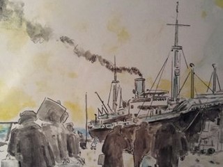 Uno scorcio – ripreso da una famosa immagine di un Film Luce che rappresenta una partenza da Pola della nave Toscana carica di esuli: sul molo donne anziane velate di nero, cariche di valigie, che definitivamente volgono le spalle all’amata città natale, sotto un nastro tricolore – del noto pittore Beppe Ricci, sarà donato al Comune di Albissola Marina.