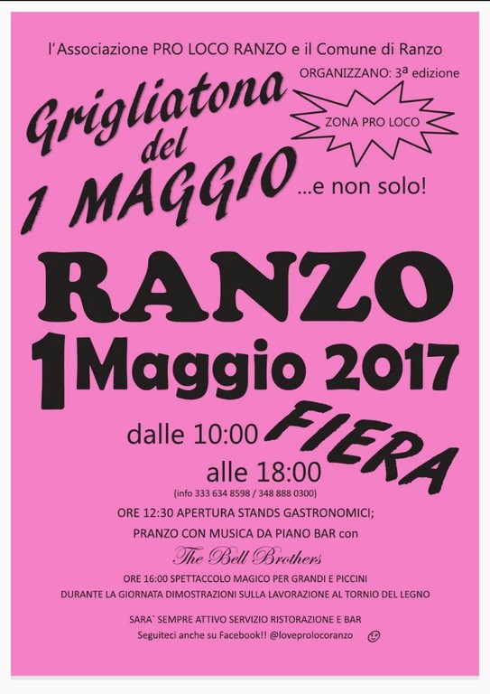 L’associazione Pro Loco Ranzo ed il Comune di Ranzo organizzano la 3° edizione della “Grigliatona del 1 Maggio” nelle aree della Pro Loco. Un appuntamento da non perdere che vedrà una attenzione particolare al territorio ed i suoi prodotti.
