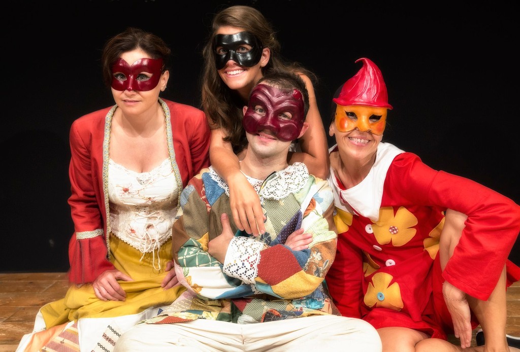 “Il vestito di Arlecchino” è una storia originale scritta da Fiorella Colombo e Lazzaro Calcagno che si inserisce nel solco della classica tradizione italiana della Commedia dell’Arte. È un gioco teatrale che coinvolge più generi, gli attori, le marionette e il cinema. Si vedono all’opera alcune maschere della Commedia dell’Arte, tra cui Arlecchino e Colombina. Il vestito di Arlecchino narra le vicende di un ragazzo povero, che abita con la madre e lavora per Pantalone, un giorno incontra Colombina e di lei si innamora perdutamente. Ma lo spirito dei boschi, Pukis, fedele al suo ruolo, cercherà di stravolgere il destino dei due innamorati. Inoltre, Arlecchino non ha un costume appropriato per andare ad un gran ballo in maschera che potrebbe segnare la svolta, da lui tanto agognata, per la sua vita. La storia racconta di come Arlecchino ebbe il suo costume tradizionale a toppe colorate. Aiutato dall’amico Pinocchio ci racconta le sue imprese per conquistare il cuore di Colombina e cercare di guadagnarsi il rispetto del mondo.