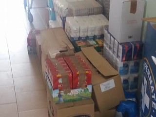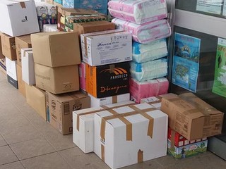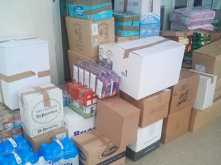 Questo il materiale consegnato: 120 Lt. latte, 40 cartoni tra farina, sale, tonno, passata, legumi, olio, dadi, budini, formaggini, the e camomilla, 19 cartoni di pasta, 8 cartoni di riso, 7 cartoni di alimenti per bambini, 20 cartoni tra grissini e focaccia, 34 cartoni di merendine e biscotti, 9 casse di acqua 10 cartoni di giochi e materiale di cancelleria, 36 cartoni di carta igienica, asciugatutto, pannoloni, assorbenti e prodotti per igiene personale e ambientale, un cartone alimenti per animali, 16 imballi di zucchero, 19 confezioni di succhi di frutta.