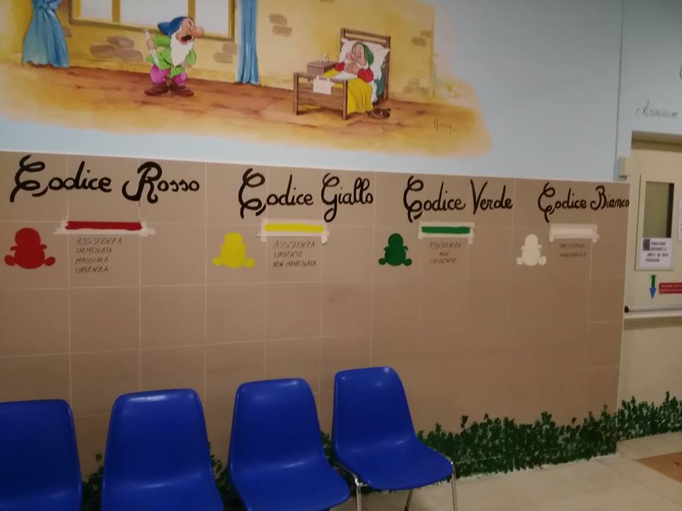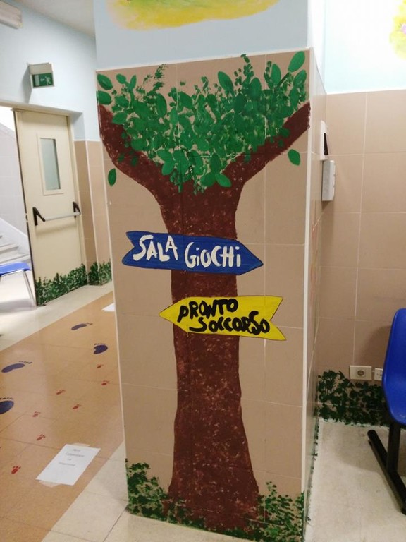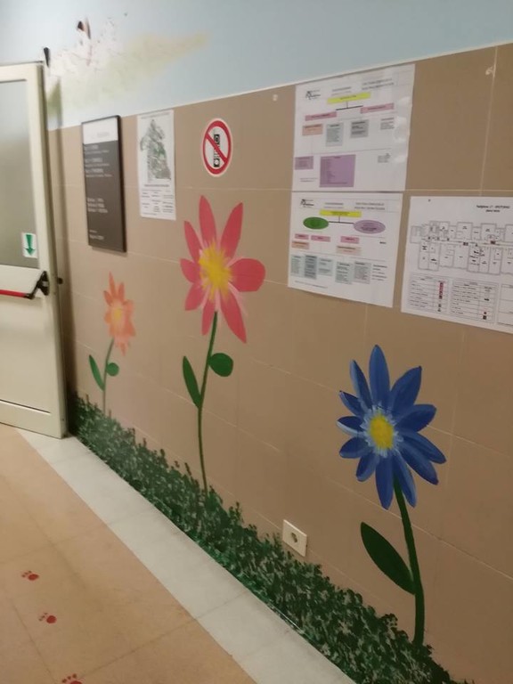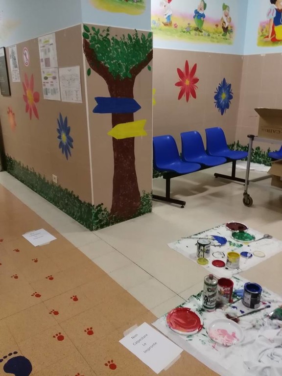 Ed ecco allora apparire sulle pareti fiori ed alberi, i colori e le indicazioni dipinte secondo i principi pedagogici che permetteranno a tutti i piccoli pazienti di sentirsi un po’ più a loro agio e magari a riuscire a superare meglio e prime alcune difficoltà.