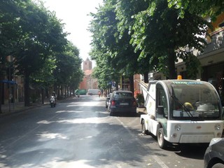 Incidente in viale Pontelungo ad Albenga dove una spazzatrice che era all'opera per un guasto ha perso carburante lungo la careggiata.