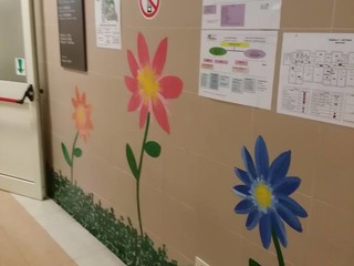 Ed ecco allora apparire sulle pareti fiori ed alberi, i colori e le indicazioni dipinte secondo i principi pedagogici che permetteranno a tutti i piccoli pazienti di sentirsi un po’ più a loro agio e magari a riuscire a superare meglio e prime alcune difficoltà.