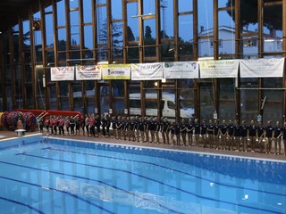Prima di entrare in acqua le ragazze a bordo piscina voltano le spalle al pubblico per mostrare il regalo che hanno ricevuto per fine stagione: un magnifico zainetto interamente sponsorizzato da Doria Nuoto per completare le loro divise.