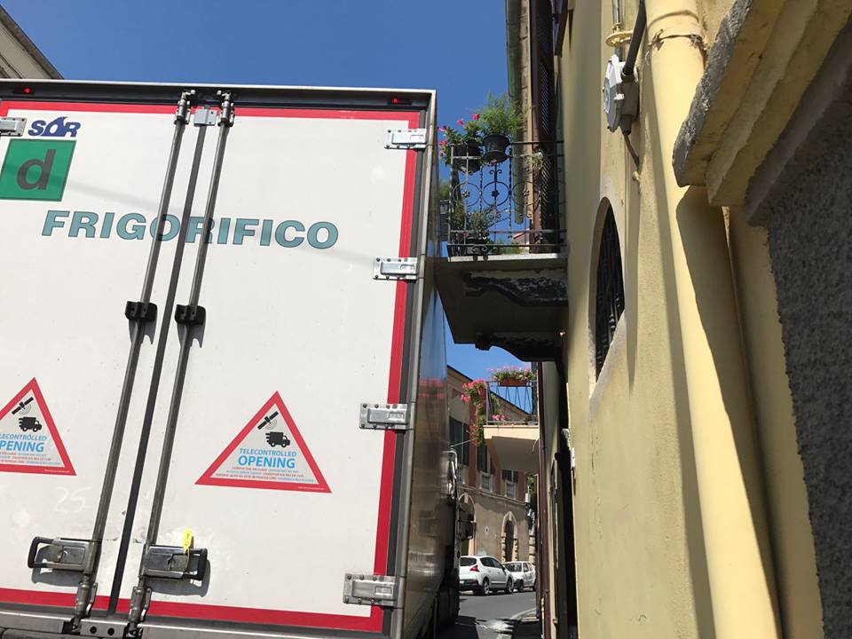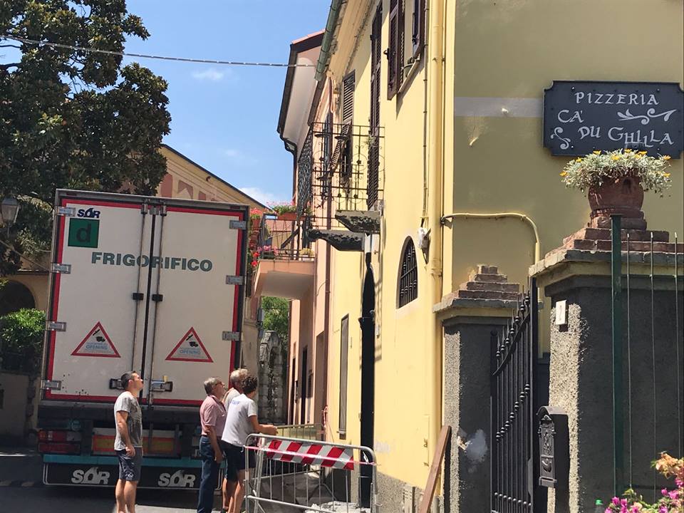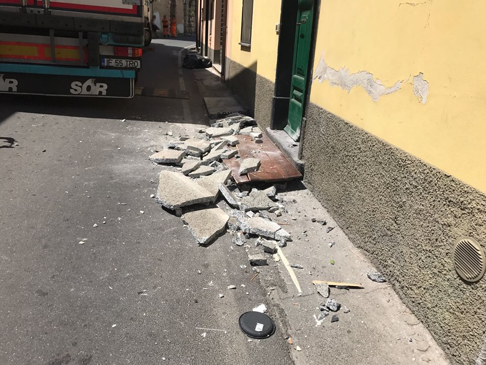 Un camion rimane incastrato nelle strette viuzze del centro storico della frazione Bastia ad Albenga e, per fare manovra e disimpegnarsi dalla problematica situazione, danneggia il terrazzino di una casa.