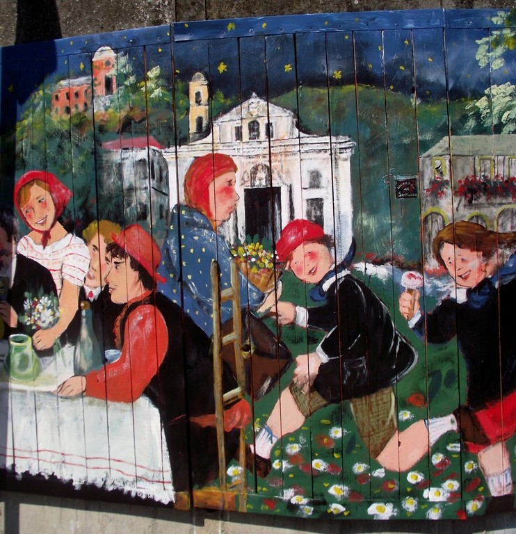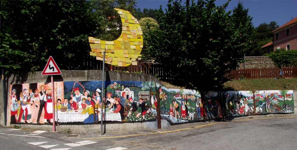 Ed è proprio la vallata ad essere raffigurata sul lungo dipinto, con i suoi abitanti ed i suoi luoghi, dalla chiesa di Santuario a quella di San Bernardo insieme con i borghi lungo il Letimbro. L’invito alla piccola festa è esteso a tutti gli abitanti della valle ed anche oltre, insieme al suggerimento di portare qualcosa da mangiare o da bere.