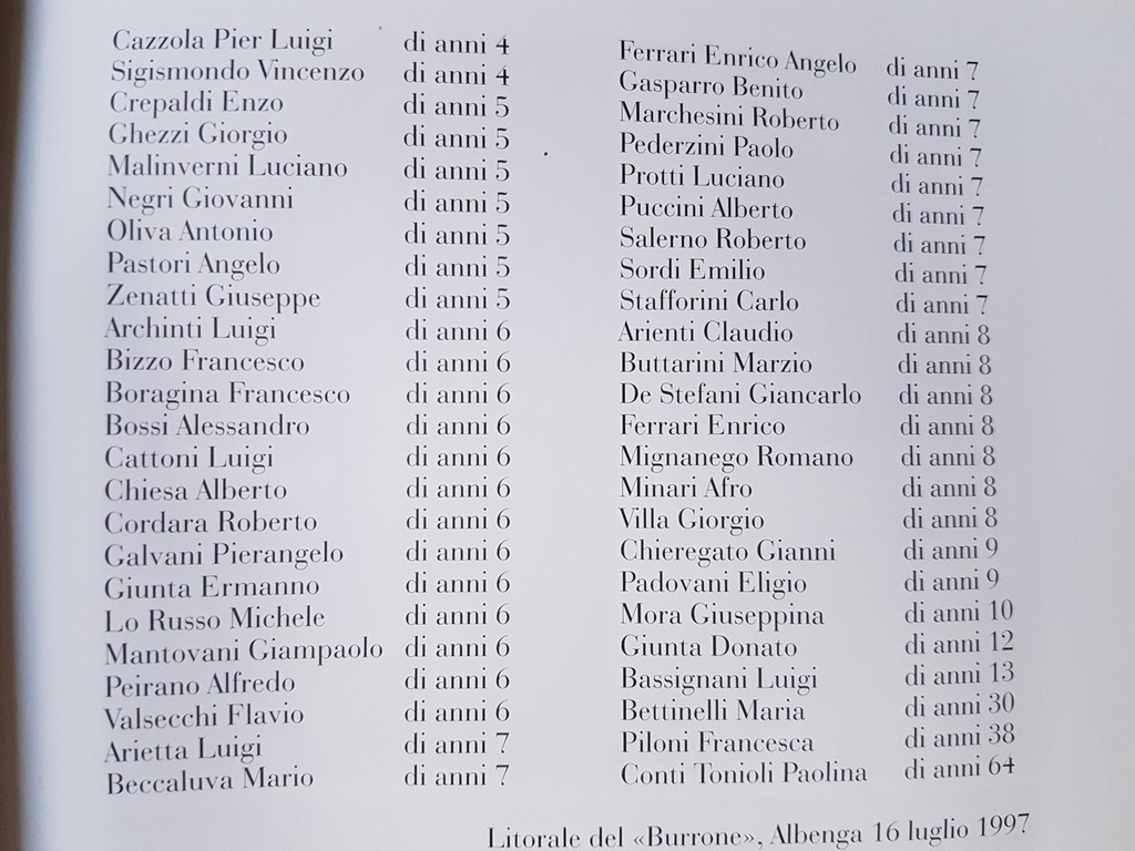 La sera quando andammo all'oratorio il parroco ci disse che quel giorno dovevamo aiutare 44 piccole anime a raggiungere velocemente il paradiso con le nostre preghiere. Andammo nella sede della Croce Bianca e ricordo ancora la schiera di bambini senza vita. Le volontarie e le donne di Albenga stavano lavando e componendo i piccoli corpi. La città rispose immediatamente al dramma con una solidarietà che Albenga sa dimostrare nel bisogno. Molte persone andarono a casa presero il vestito “della domenica” dei propri figli per vestire quei corpicini. Da allora capii che la Croce Bianca era il posto dove volevo stare e non ne sono più uscito”.