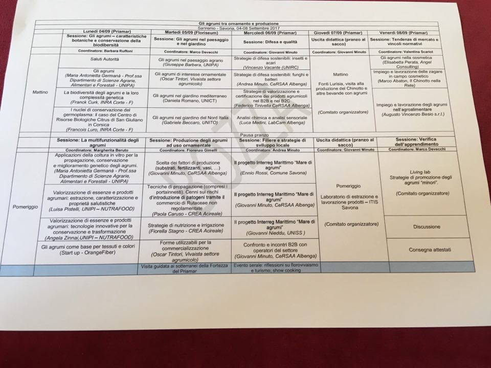 Botanica e biodiversità degli agrumi; Multifunzionalità degli agrumi; Gli agrumi nel paesaggio e nel giardino;La produzione degli agrumi ad uso ornamentale; Difesa e qualità degli agrumi; Le Strategie di Sviluppo Locale;Le tendenze di mercato e i vincoli normativi. Inoltre sono organizzate:Una visita agli impianti di produzione del Chinotto di Savona e altre bevande con agrumi; Una visita ad un laboratorio di estrazione e di lavorazione di prodotti cosmetici; Un Living Lab svolto dai corsisti con la partecipazione del Comitato Scientifico e di operatori del settore. E la durata del corso sarà di 40 ore.