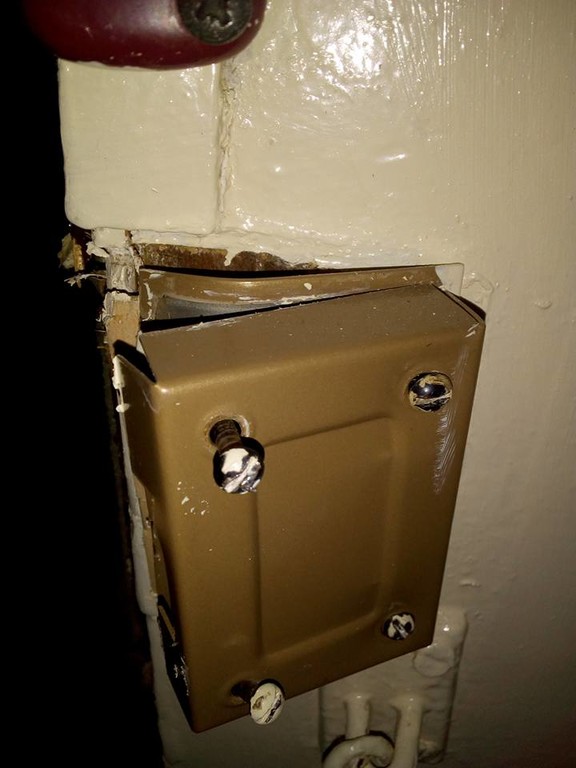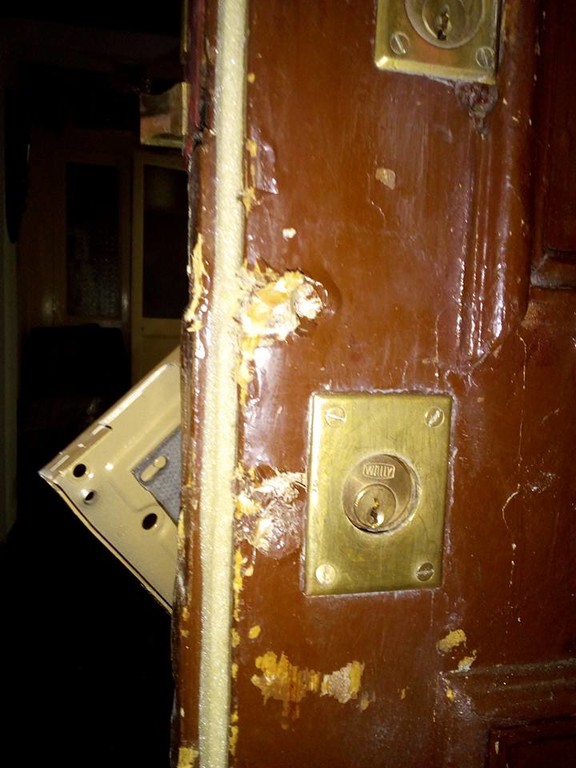 La serratura di un appartamento distrutta, presumibilmente con un grosso cacciavite