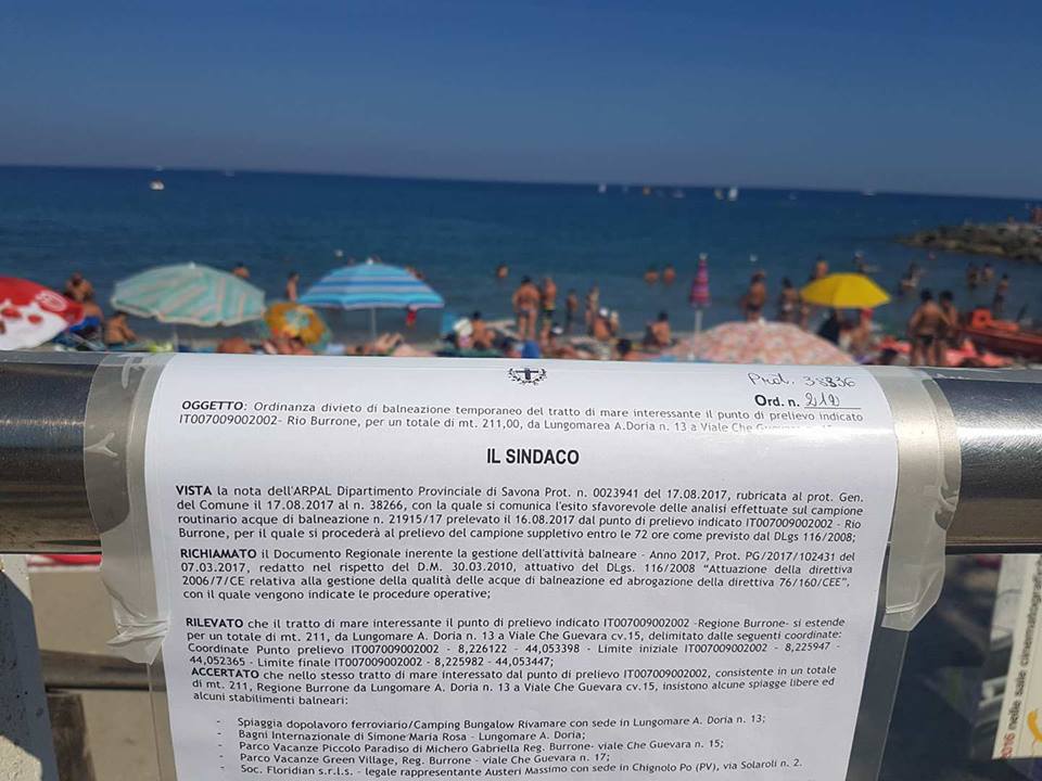 Anche ad Albenga il sindaco ha emesso un'ordinanza di divieto di balneazione per la zona che va dal molo del circolo nautico a quello del camping Piccolo Paradiso.