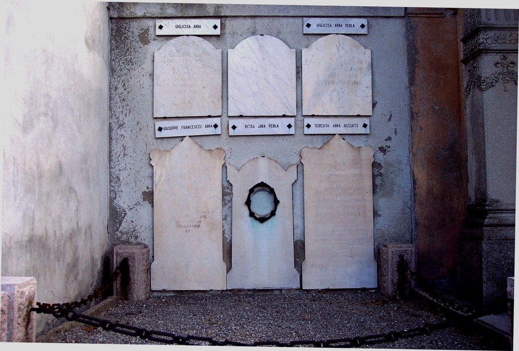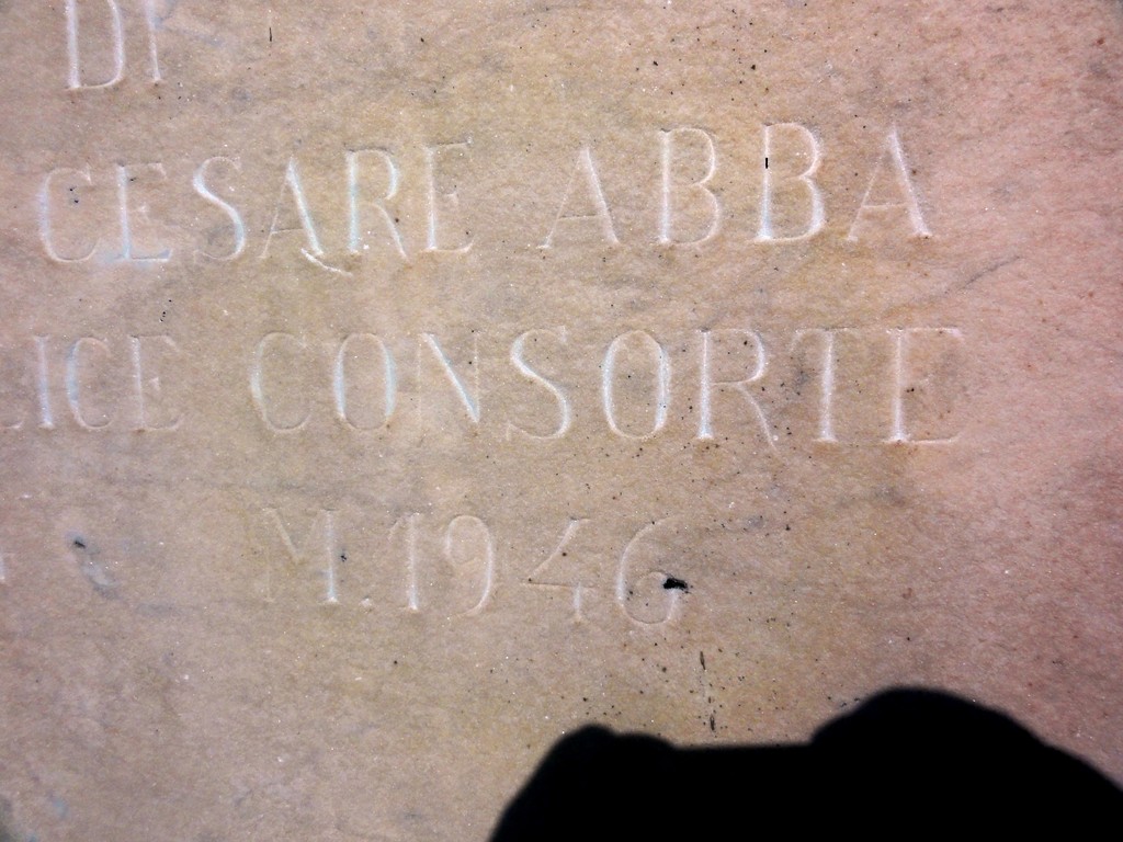 Era il primo pomeriggio di fine settembre, e mi sono prestato volentieri per la sua ricerca storica.…Ho decifrato: Teresita Rizzatti di Giuseppe Cesare Abba, degna felice consorte, nata nel 1864… morta nel 1946, forse a Brescia dove risiedeva la famiglia. La luce radente mi ha sorriso sulla lapide porosa e consunta.