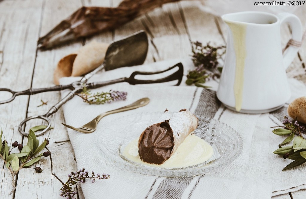 Dolce: Cannoli di cialda agli amaretti con mousse al fondente e zabaione al rum di Sara Milletti, L’appetito vien leggendo