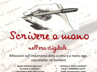 Ha ancora senso scrivere a mano nell’era digitale? Quale relazione intercorre fra mano e cervello? E’ importante lo stile corsivo? Scrittura a mano o tastiera? D.S.A. - DISGRAFIA cos’è? Come riconoscerla e come intervenire: ecco alcune delle domande alle quali si cercherà di dare risposta durante l’incontro.