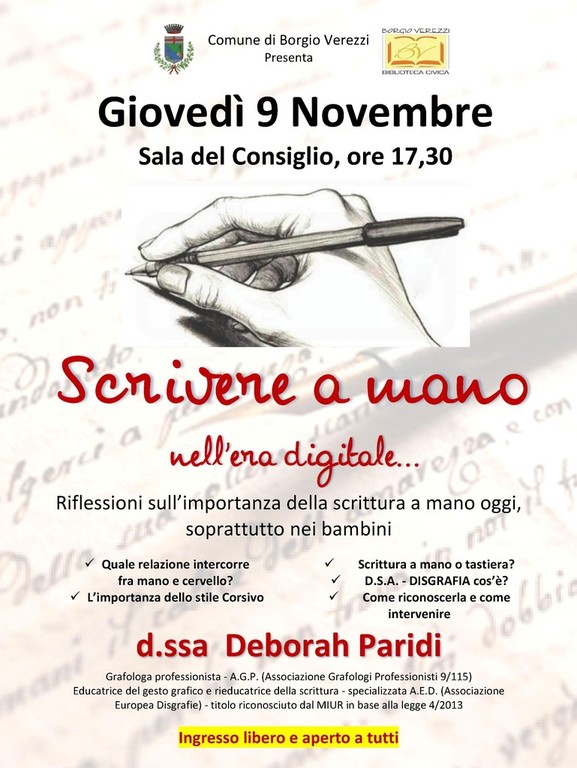 Giovedì 9 Novembre alle ore 17,30 nella Sala del Consiglio del Comune di Borgio Verezzi, la d.ssa Deborah Paridi parlerà dell’importanza della scrittura a mano nell’era digitale, soprattutto nei bambini e adolescenti, e affronterà fra l’altro anche la tematica delle possibili patologie della scrittura (DSA, disgrafie, ecc.).