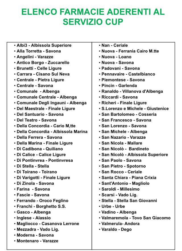 Per espletare il servizio l’ASL fornisce alle Farmacie la modalità di accesso al Servizio CUP, tramite collegamento internet, così come avviene per lo sportello fisico. Tale modalità, che facilita sensibilmente tutte le operazioni previste, viene offerta inizialmente in forma sperimentale, per alcune Farmacie pilota, per essere, successivamente, messa a disposizione di tutte le Farmacie aderenti al progetto (68 farmacie totali su 116, in allegato la foto con l'elenco delle farmacie aderenti).