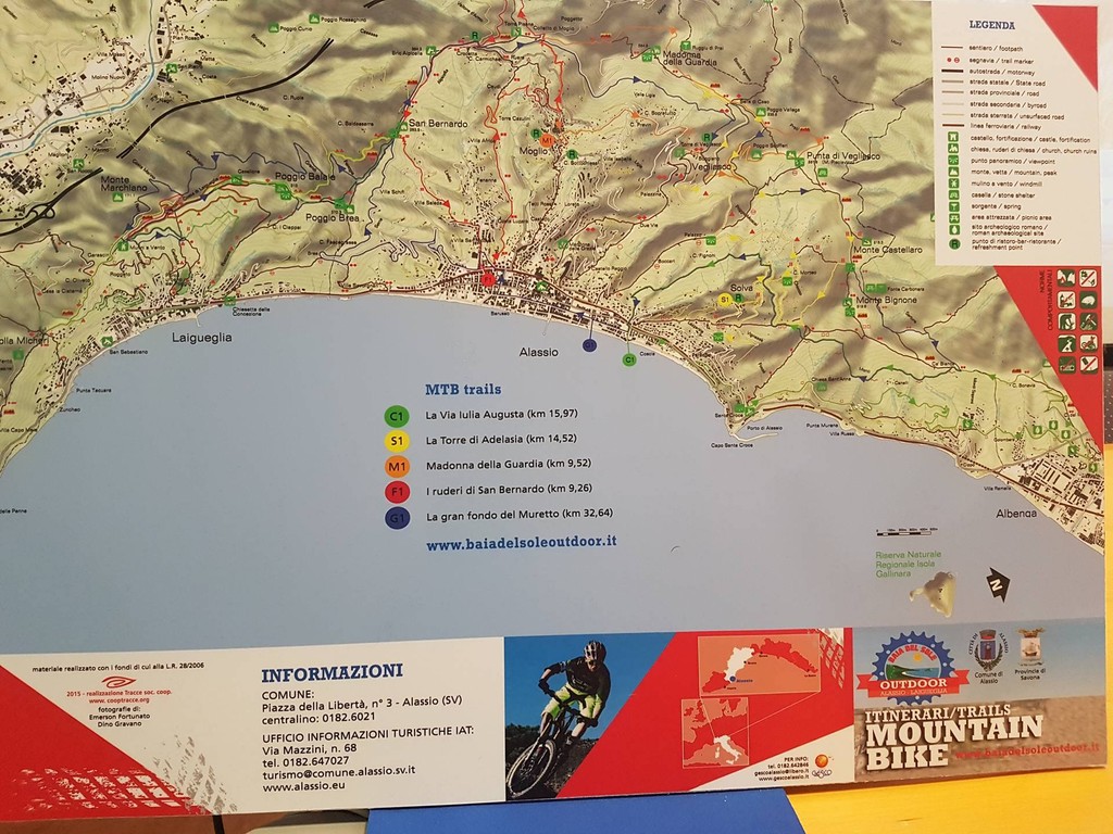 La prima stesura sulle cartine ha interessato 5 sentieri sul territorio di Alassio e 4 sentieri sul territorio di Laigueglia. I percorsi sono tutti molto panoramici e al loro interno si possono trovare riferimenti culturali e storici come ad esempio sentiero C1 denominato 'La Via lulia Augusta' dove il turista potrà percorrere l'antica Strada Romana e costeggiare gli antichi reperti archeologici dell'età romana. Altri monumenti che il ciclo turista potrà ammirare sono la Torre di Vegliasco, i ruderi di San Bernardo, la Chiesa di S. Anna, la Chiesa della Madonna della Guardia, ecc.