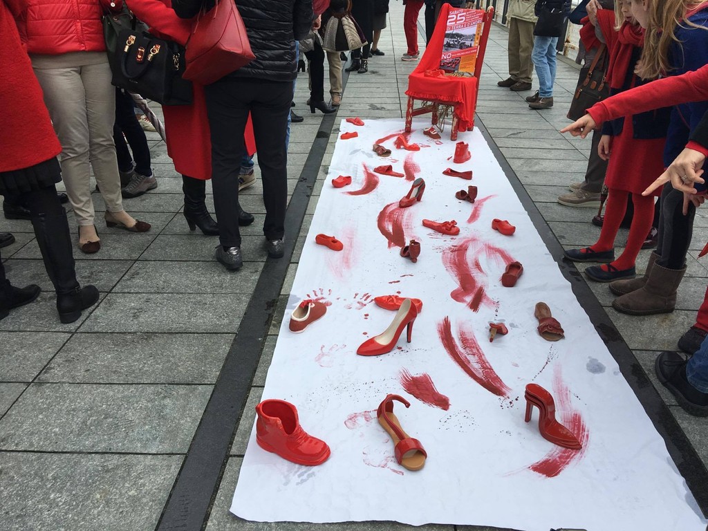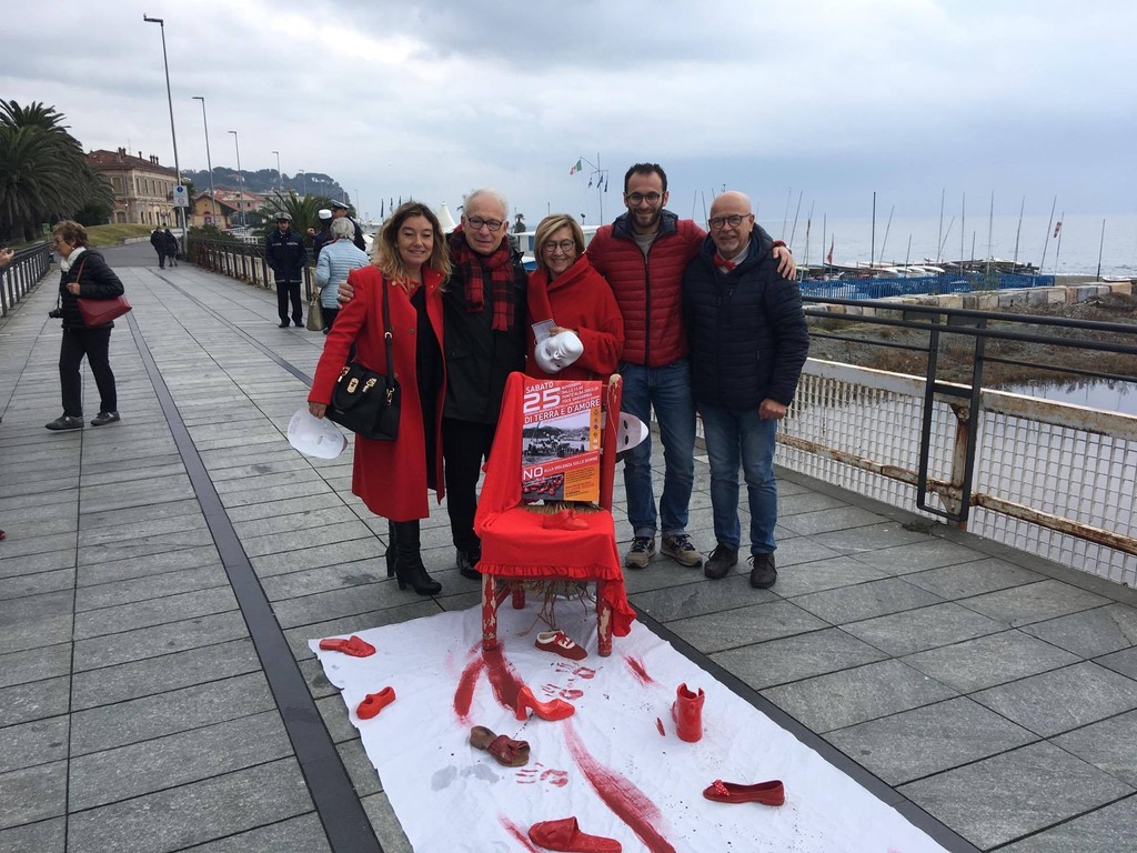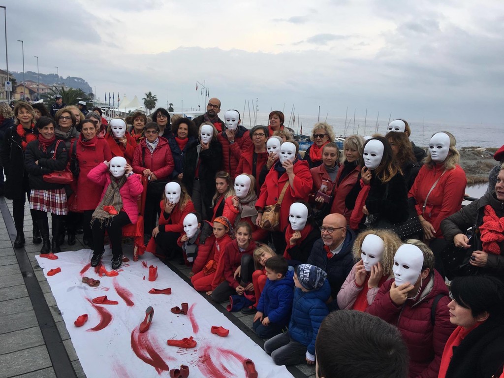 Un telo bianco con sfumatore di rosso che ha visto appoggiate le scarpe di ceramica rossa, una specie di “Flash Mob” nato dall’idea dell’Associazione Italiana Città della Ceramica con la particolarità delle maschere indossate dalle donne presenti per significare che la violenza non ha volto: “Le scarpe sono state realizzate da diversi ceramisti locali come simbolo, veicolo culturale contro questo triste fenomeno - spiega l’Assessore Luca Ottonello - saranno oggetto di mostre locali temporanee che andranno in giro per l’Italia e le spediremo a Faenza (sede dell’Associazione) e di una campagna social e web che si sta già diffondendo da ieri a livello nazionale e che noi manterremo come dossier fotografico e spenderemo come promozione e sensibilizzazione della cultura in questo tema”.