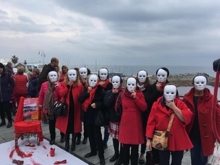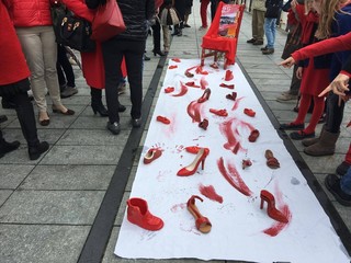Un telo bianco con sfumatore di rosso che ha visto appoggiate le scarpe di ceramica rossa, una specie di “Flash Mob” nato dall’idea dell’Associazione Italiana Città della Ceramica con la particolarità delle maschere indossate dalle donne presenti per significare che la violenza non ha volto: “Le scarpe sono state realizzate da diversi ceramisti locali come simbolo, veicolo culturale contro questo triste fenomeno - spiega l’Assessore Luca Ottonello - saranno oggetto di mostre locali temporanee che andranno in giro per l’Italia e le spediremo a Faenza (sede dell’Associazione) e di una campagna social e web che si sta già diffondendo da ieri a livello nazionale e che noi manterremo come dossier fotografico e spenderemo come promozione e sensibilizzazione della cultura in questo tema”.