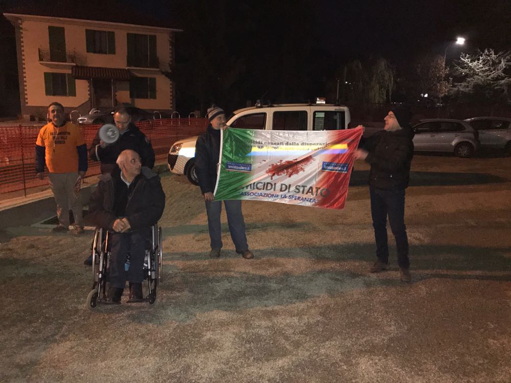 "Omicidi di Stato" e "No ius soli", si legge nei cartelli di un gruppo di contestatori che ha deciso di attendere l'ex presidente del consiglio (e oggi segretario nazionale del PD) Matteo Renzi nella visita agli stabilimenti Noberasco a Carcare.