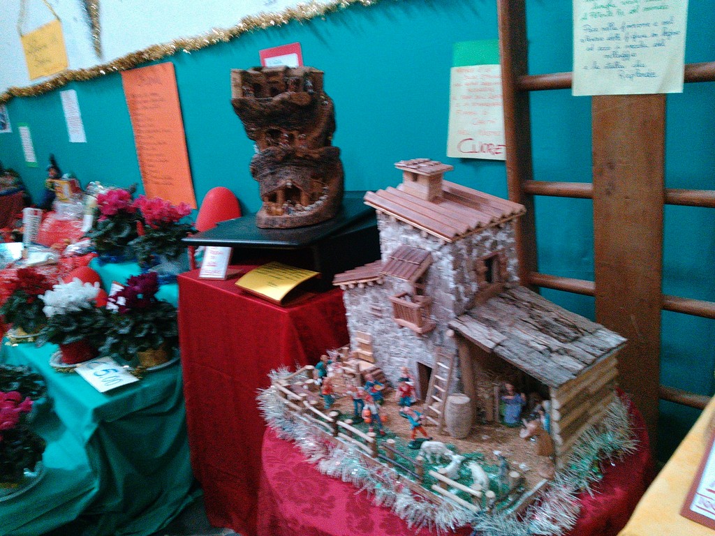 E mentre giriamo nella sala dell’Oratorio veniamo letteralmente rapiti dalle opere dei bambini, ma anche dal grande albero di Natale in materiale riciclato, dal presepe ricavato dalle pagine di libro sapientemente ripiegate da Patrizia, dalla capanna del Bambin Gesù realizzata con pezzi di arnie a simboleggiare l'importante produzione di miele della zona, dal grande trenino elettrico con componenti di oltre 40 anni fa… Insomma: sembra una vera e propria favola realizzata da e per bambini da 0 a 90 anni!