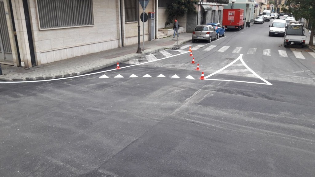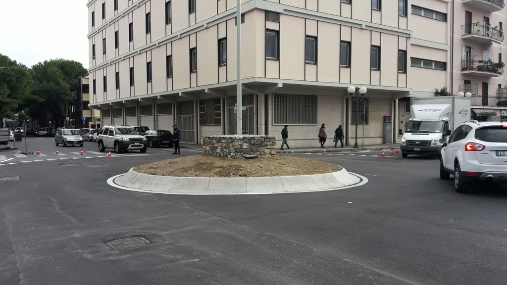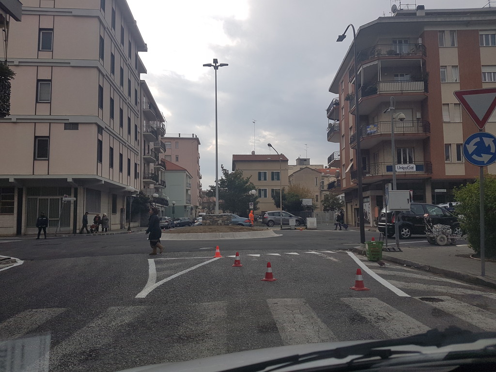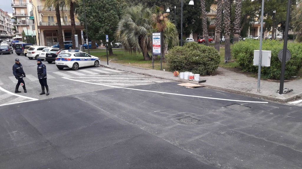 Proseguono i lavori ed la rotonda di piazza XX settembre ad Albenga. In atto la sistemazione della segnaletica orizzontale. I vigili urbani regolano la viabilità sul tratto. Qualche piccolo disagio alla circolazione nella zona anche per la contemporanea presenza del mercato settimanale.