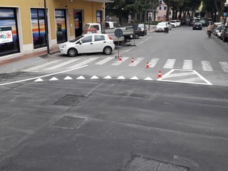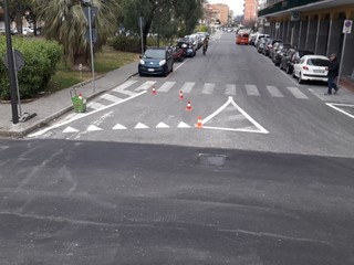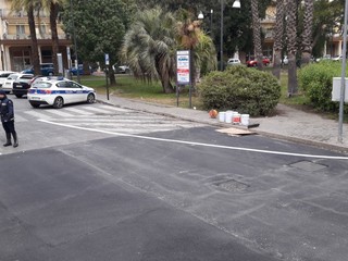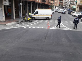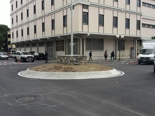 Proseguono i lavori ed la rotonda di piazza XX settembre ad Albenga. In atto la sistemazione della segnaletica orizzontale. I vigili urbani regolano la viabilità sul tratto. Qualche piccolo disagio alla circolazione nella zona anche per la contemporanea presenza del mercato settimanale.