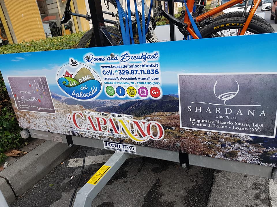 Veniamo ora agli aspetti tecnici: “Questo carrello, sponsorizzato in toto dall'Associazione Albergatori di Loano, dalla Pizzeria Spuntino (dove avremmo dovuto fare la presentazione), dal ristorante Shardana al porto, da 'La casa dei balocchi' e dal ristorante Il Capanno, in accordo con gli albergatori loanesi ci servirà per finanziare la pulizia dei sentieri del comprensorio in modo tale da creare una rete sentieristica dedicata al MTB sul territorio Loanese che nulla avrà da invidiare a nessun’altra realtà oggi presente altrove”.