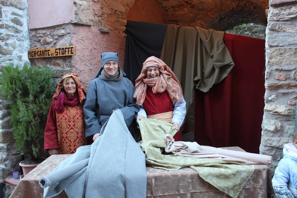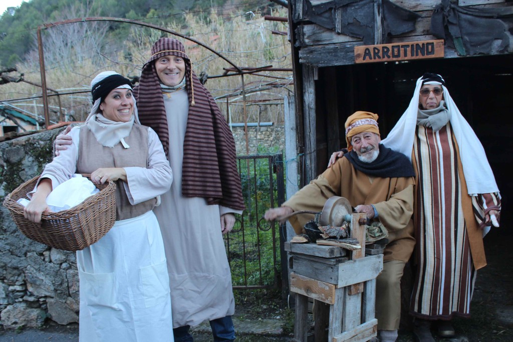 Bastano pochi passi e il pubblico è subito coinvolto da un viaggio nel passato, complice l’architettura tipica ligure del borgo, arroccato su una collina di uliveti. Nelle cantine e nelle piazze, rivivono gli antichi mestieri come il calzolaio, il vasaio, l’arrotino, il maniscalco, il fabbro, il panettiere, le lavandaie e il falegname. Non mancherà anche la possibilità di apporre la propria firma per il Censimento, subito dopo aver visitato la capanna ove viene rievocata la Natività. Altro elemento di novità rispetto alle edizioni passate è rappresentato dalla Scuola, nella quale si potrà assistere alla lezione impartita dal maestro ai suoi alunni.