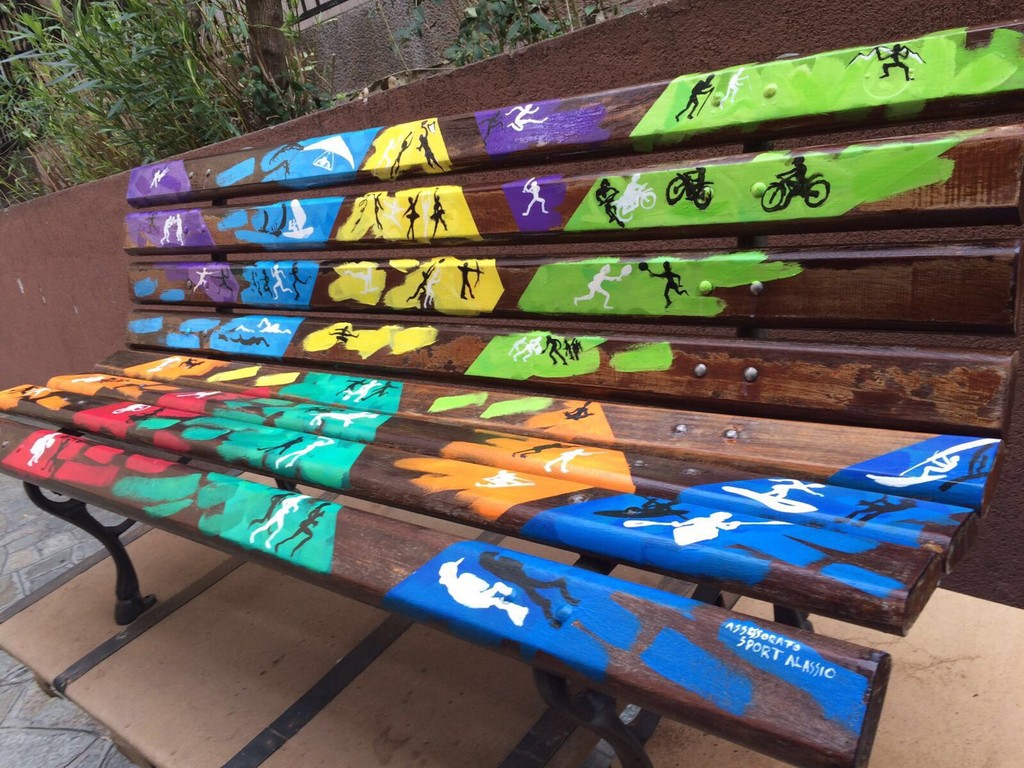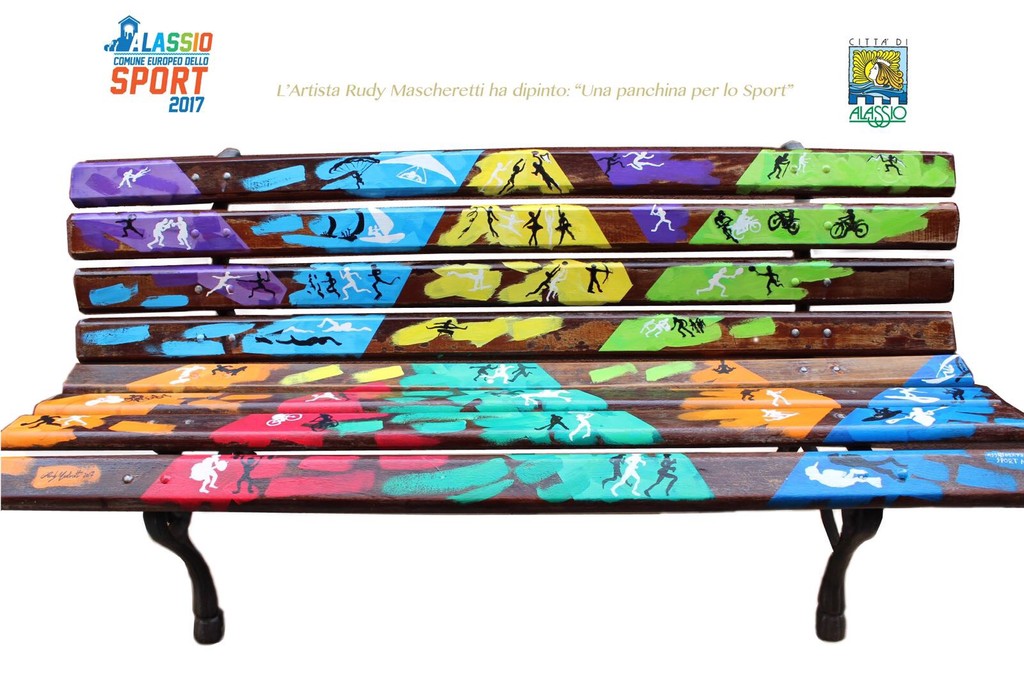 Una panchina artistica dedicata allo sport. Dopo la panchina rosa per la lotta al tumore al seno, quella arancione per la Giornata internazionale contro la violenza sulle donne, quella blu per la Giornata mondiale dell'autismo, quella colorata in onore della “Festa dei Colori”, ecco arrivare la panchina celebrativa di “Alassio Città Europea dello Sport”, posizionata in via Cavour e dipinta dall'artista Rudy Mascheretti.