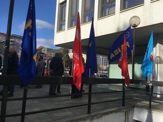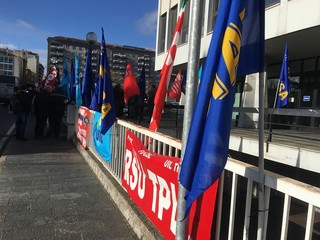 Si fanno sentire i clacson degli autobus di Tpl in occasione del presidio dei lavoratori e dei sindacati sotto la sede della Provincia di Savona in segno di protesta contro la privatizzazione dell’azienda, novità giunta con la pubblicazione da parte di Palazzo Nervi e dalla Regione del bando pubblico di gara.