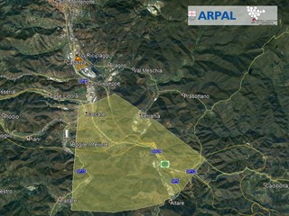 Nella foto la proiezione su mappa delle condizioni più verosimili e cautelative per la ricaduta delle polveri