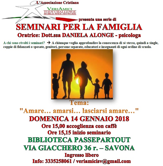 L'associazione cristiana "Veriamici Onlus" presenta una serie di seminari in famiglia con oratrice la dott.ssa psicologa Daniela Alonge. Il tema sarà "Amare… amarsi… lasciarsi amare…”.
